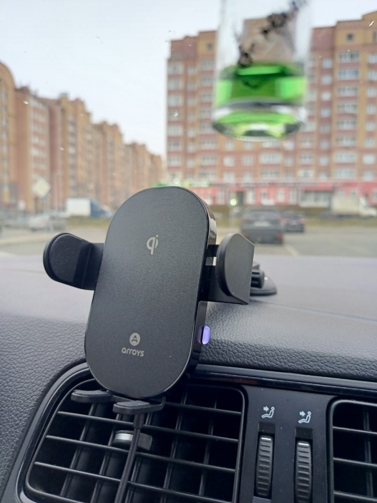 Автомобильное зарядное устройство для смартфона Arroys CR-6 выполнено в пластиковом корпусе, лицевая часть зарядки окаймлена цветовой подсветкой.