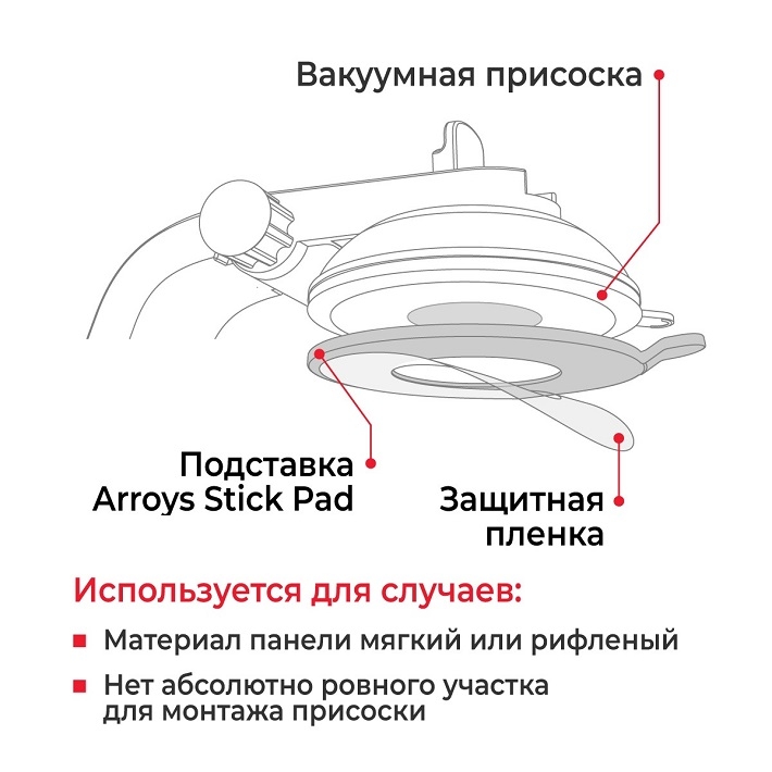 Подставка для вакуумной присоски Arroys Stick Plate применяется в случаях, когда на приборную панель невозможно установить держатель с креплением на вакуумную присоску. Установка вакуумных присосок проблематична на панели, выполненные из мягкого материала, материала с сильным рифлением или когда невозможно найти абсолютно ровный участок для монтажа. Физические основы работы вакуумной присоски не позволяют в таких случаях выполнить монтаж с надежной фиксацией. Подставка крепится на двухсторонний скотч и потом уже на подставку крепится вакуумная присоска.